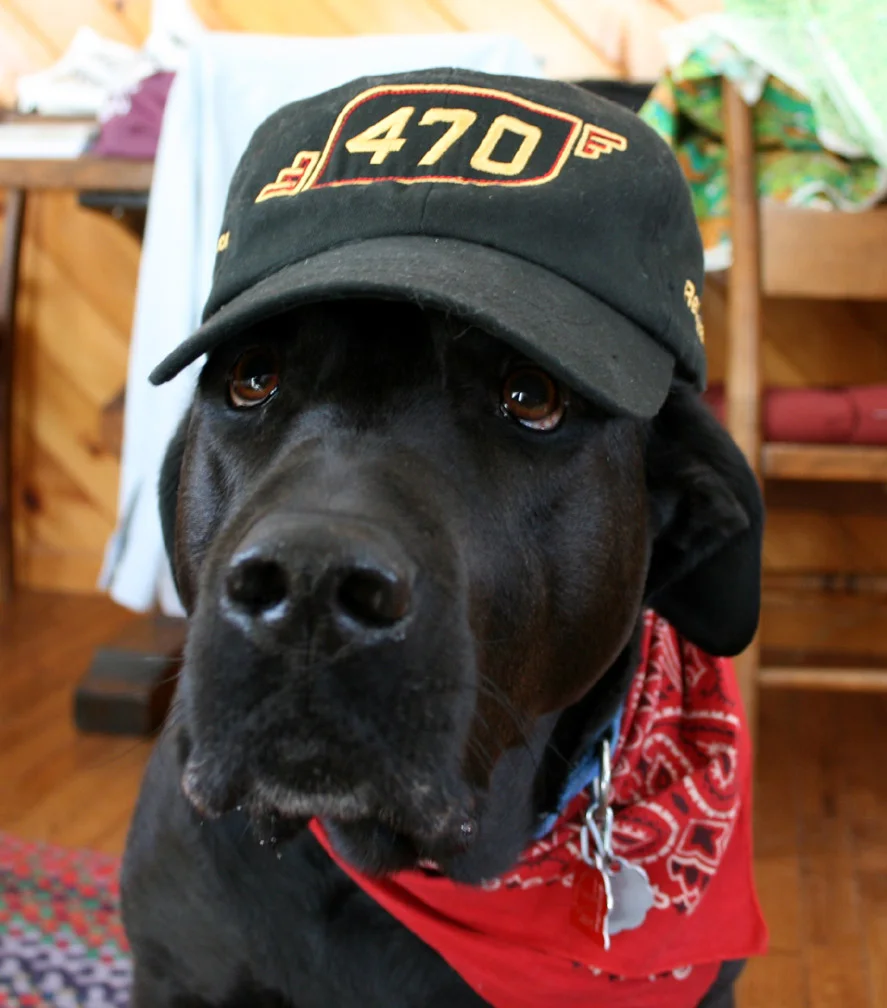 Black cotton, all cloth, including the back, embroidered tender speed logo in red and gold, with "470" stitched boldly in the center. NESCO website on one side, "Restoration" on the opposite. Adjustable cloth strap with bronze finish adjustment slide. Caps stitched in Maine!