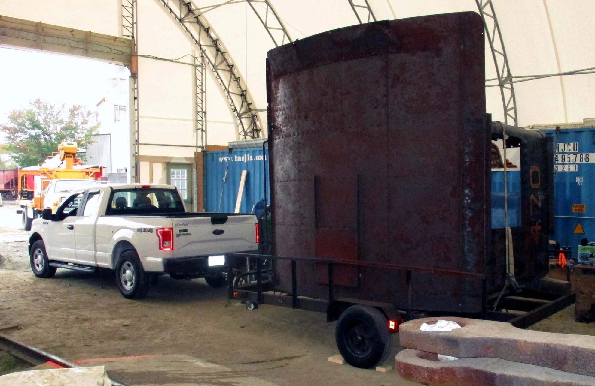Using Dick’s trailer, same crew working, we loaded the 470 cab and brought it indoors for cleaning and restoration. We are going to need to remove the paint, then needle scale the daylights out of it. Other surface preparation will be required before we can prime it, but the cab's indoors at last!
